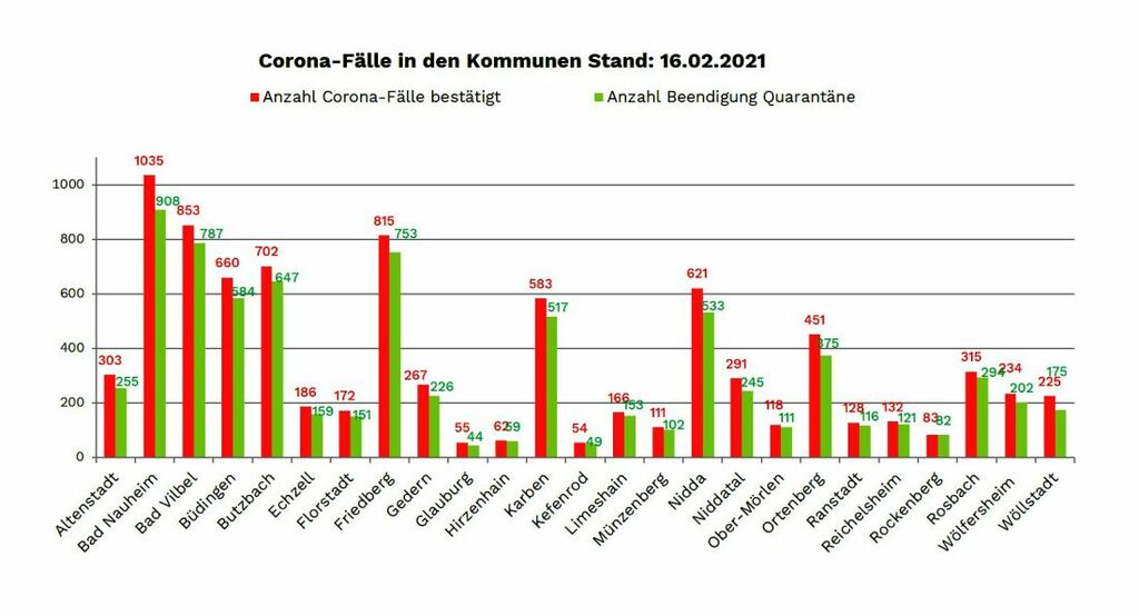 Die Zahl der seit Beginn der Pandemie nachgewiesenen Fälle von Corona-Infektionen im Wetteraukreis liegt am Dienstag (16. Februar) bei 8.622, das sind 25 mehr als am Montag. Die Zahl der aus der Quarantäne entlassenen Menschen wird mit 7.648 gemeldet, das sind 68 mehr als am Montag. Die Neuinfektionen wurden gemeldet aus: Bad Nauheim (2), Bad Vilbel (3), Büdingen (1), Butzbach (6), Echzell (1), Friedberg (3), Karben (1), Kefenrod (1), Niddatal (3), Ober Mörlen (1), Rosbach (2) und Wöllstadt (1).
