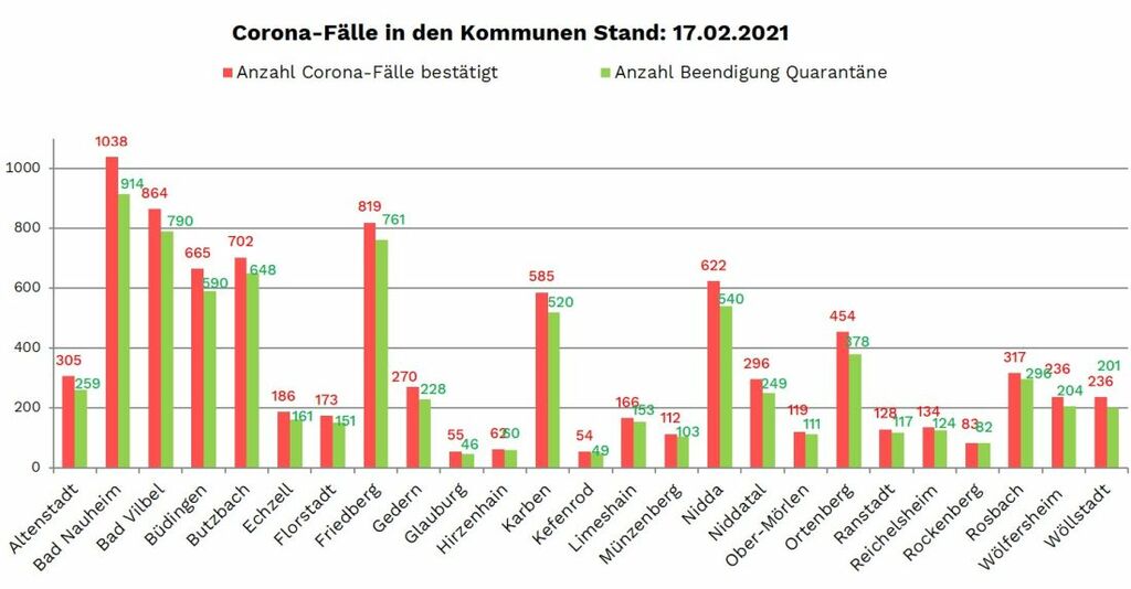 Die Neuinfektionen wurden gemeldet aus: Altenstadt (2), Bad Nauheim (3), Bad Vilbel (11), Büdingen (5), Florstadt (1), Friedberg (4), Gedern (3), Karben (2), Münzenberg (1), Nidda (1), Niddatal (5), Ober Mörlen (1), Ortenberg (3), Reichelsheim (2), Rosbach (2), Wölfersheim (2) und Wöllstadt (11). Die Neuinfektionen in Wöllstadt stammen aus einer Senioreneinrichtung.