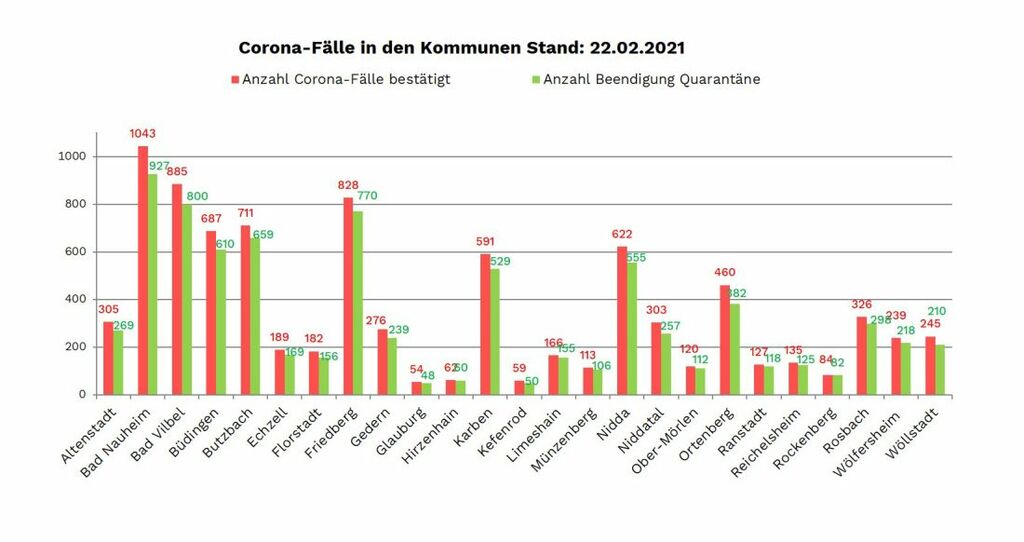 Die Zahl der seit Beginn der Pandemie nachgewiesenen Fälle von Corona-Infektionen im Wetteraukreis liegt am Montag (22. Februar) bei 8.812 das sind 68 mehr als am Freitag. Die Zahl der aus der Quarantäne entlassenen Menschen wird mit 7.904 gemeldet, das sind 74 mehr als am Freitag. Die Neuinfektionen wurden gemeldet aus: Bad Nauheim (4), Bad Vilbel (9), Büdingen (6), Butzbach (4), Florstadt (6), Friedberg (7), Gedern (1), Karben (3), Kefenrod (6), Münzenberg (2), Niddatal (6), Ortenberg (1), Reichelsheim (2), Rockenberg (1), Rosbach (6) und Wöllstadt (4).