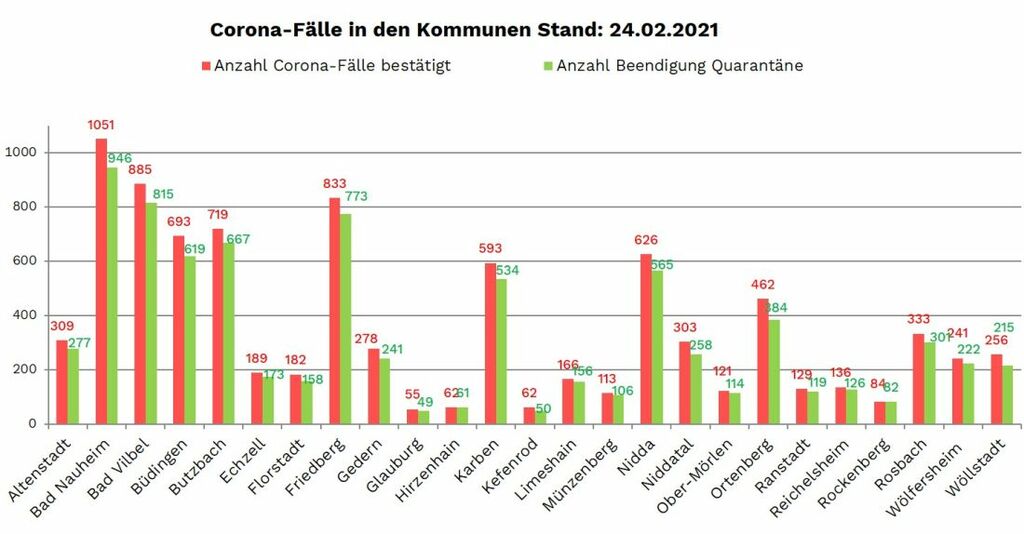 Die Neuinfektionen wurden gemeldet aus: Altenstadt (2), Bad Nauheim (4), Bad Vilbel (2), Büdingen (5), Butzbach (1), Friedberg (4), Gedern (2), Glauburg (1), Kefenrod (3), Nidda (3), Niddatal (1), Ober-Mörlen (1), Ranstadt (2), Reichelsheim (1), Rosbach (3), Wölfersheim (2) und Wöllstadt (7).