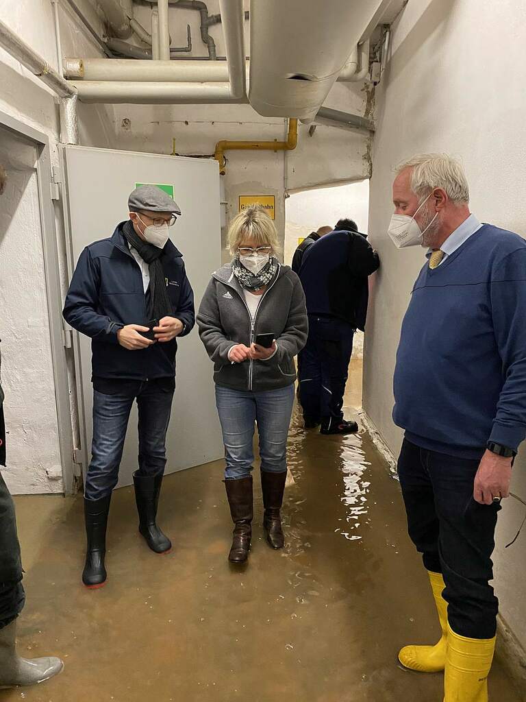 Foto: Vollgelaufener Keller in der Stadtschule Büdingen. vl Landrat Jan Weckler, Schulleiterin Sabine Weigandt und Bürgermeister Erich Spamer