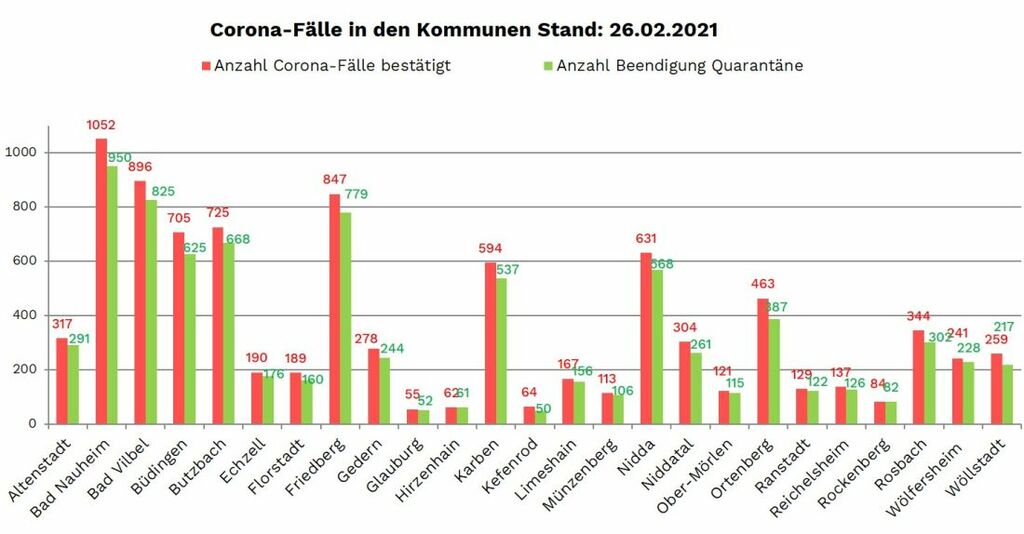 Die Zahl der seit Beginn der Pandemie nachgewiesenen Fälle von Corona-Infektionen im Wetteraukreis liegt am Freitag (26. Februar) bei 8.967 das sind 39 mehr als am Donnerstag. Die Zahl der aus der Quarantäne entlassenen Menschen wird mit 8.088 gemeldet, das sind 35 mehr als am Vortag. Die Neuinfektionen wurden gemeldet aus: Altenstadt (6), Bad Nauheim (1), Bad Vilbel (5), Büdingen (3), Butzbach (3), Echzell (1), Florstadt (2), Friedberg (5), Karben (1), Kefenrod (1), Ortenberg (1), Rosbach (7) und Wöllstadt (3).