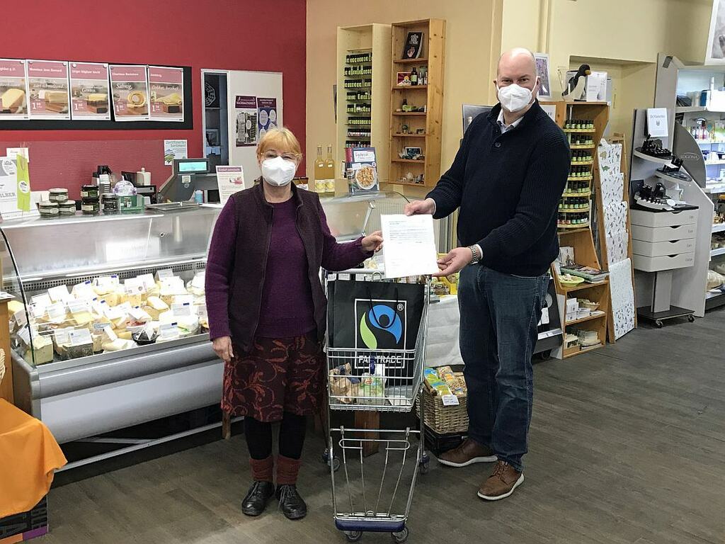 Foto: Kreisbeigeordneter Matthias Walther und Marlu Müller-Bremm, Inhaberin des Bioladens Regenbogen in Friedberg.