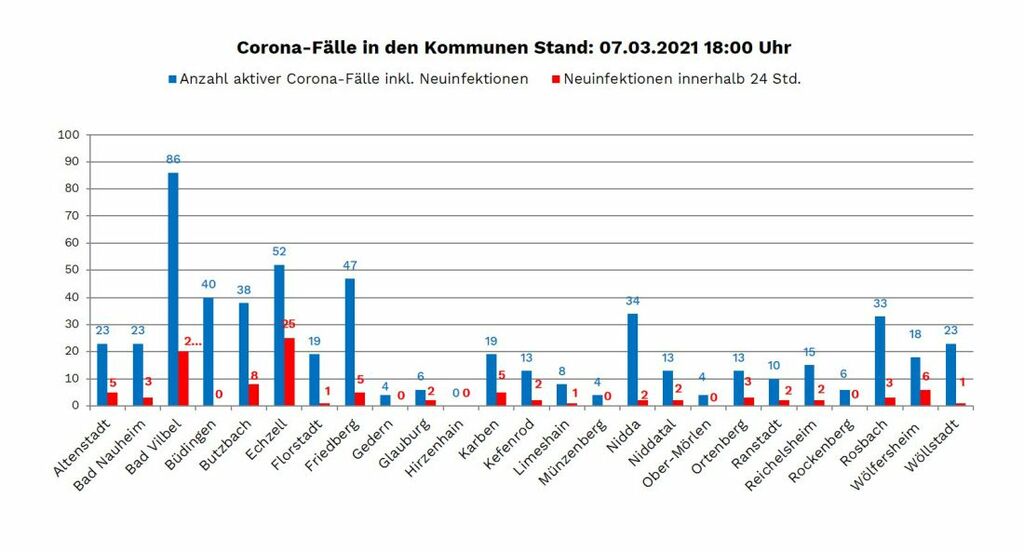 In Echzell kam es zu einem Ausbruch in einer Einrichtung für Asylbewerber, in Bad Vilbel kam es zu Ausbrüchen in zwei Kindertagesstätten. Bei den hier aufgeführten 98 Neuinfektionen in den Kommunen sind 26 Neuinfektionen vom Sonntag noch nicht berücksichtigt, sie werden am Dienstag nachgereicht.