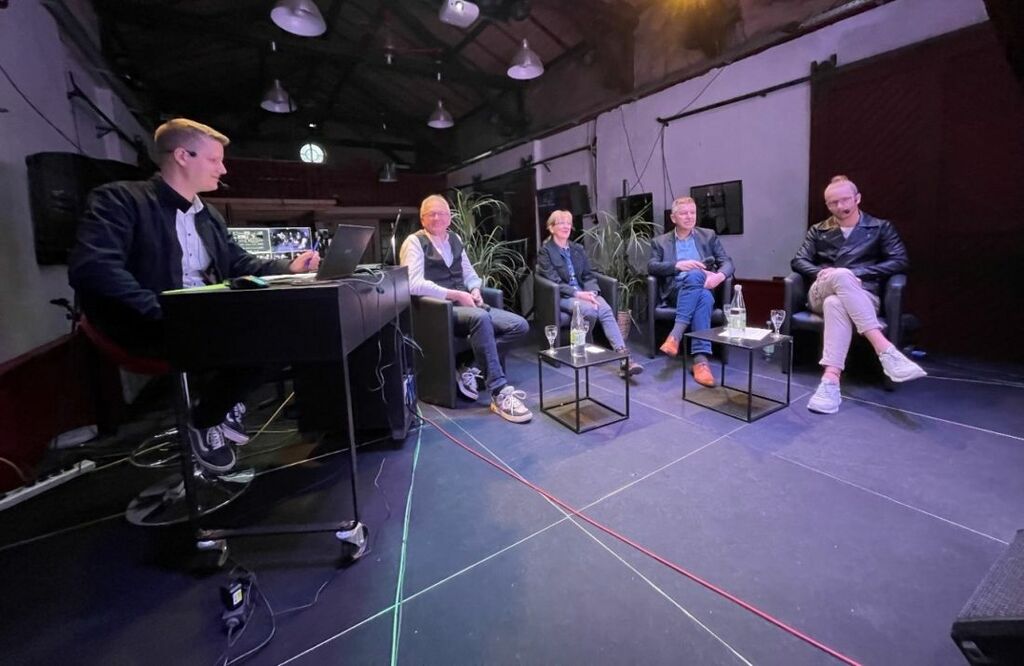 Foto: Auf der Bühne der Kulturhalle Stockheim fand am 22. April die erste Infoveranstaltung statt. Von links: Oliver Schmidt, Wirtschaftsförderung Wetterau (WRW), Harald Steinke, Kulturhalle, Conny Dörr, TourismusRegion Wetterau (WRW), André Haußmann, Agentur 360° (Vorsitzender WRW), Maximilian Häßner, Textilium Nidda (Foto: privat)