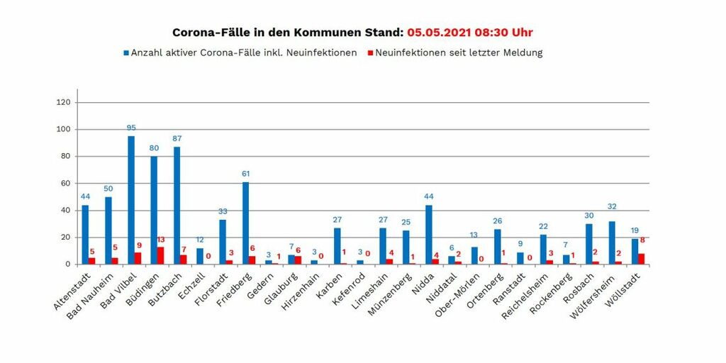 Die Zahl der nachgewiesenen Fälle von Corona-Infektionen im Wetteraukreis liegt am Mittwoch (5.Mai) bei 12.377 (Stand RKI 00:00 Uhr), 66 mehr als am Dienstag. Neuinfektionen wurden gemeldet aus: Altenstadt (5), Bad Nauheim (5), Bad Vilbel (9), Büdingen (13), Butzbach (7), Florstadt (3), Friedberg (6), Gedern (1), Glauburg (6), Karben (1), Limeshain (4), Münzenberg (1), Nidda (4), Niddatal (2), Ortenberg (1), Reichelsheim (3), Rockenberg (1), Rosbach (2), Wölfersheim (2) und Wöllstadt (8).