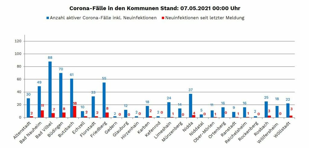 Die Zahl der nachgewiesenen Fälle von Corona-Infektionen im Wetteraukreis liegt am Freitag (7.Mai) bei 12.523 (Stand RKI 00:00 Uhr), 74 mehr als am Donnerstag. Neuinfektionen wurden gemeldet aus: Altenstadt (2), Bad Nauheim (11), Bad Vilbel (7), Büdingen (8), Butzbach (18), Echzell (2), Florstadt (2), Friedberg (8), Karben (2), Limeshain (1), Nidda (4), Ober Mörlen (1), Ranstadt (1), Reichelsheim (1), Rosbach (3) und Wöllstadt (3).