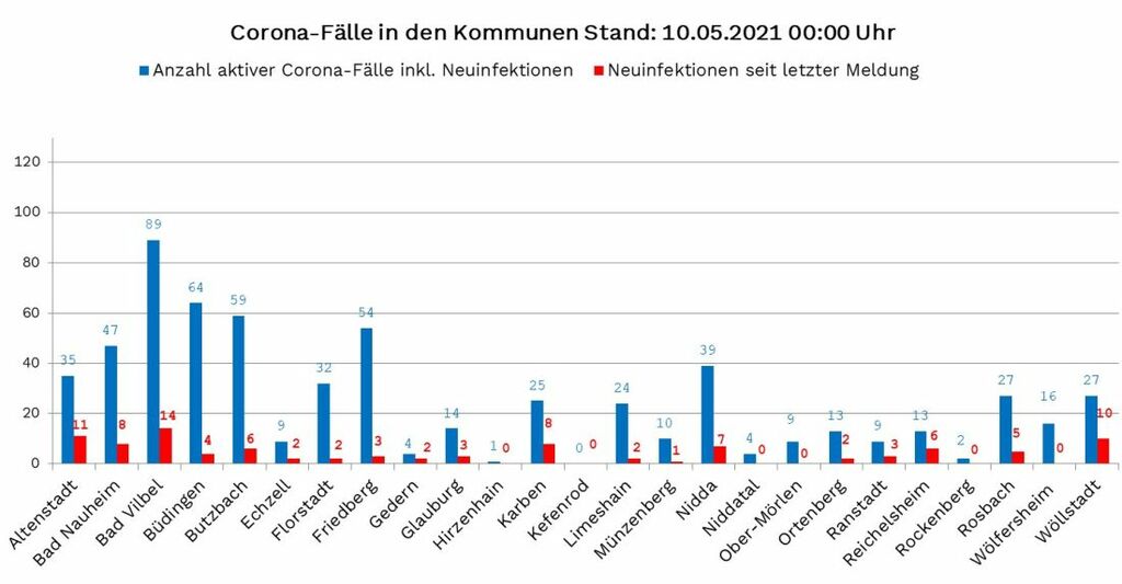Die Zahl der nachgewiesenen Fälle von Corona-Infektionen im Wetteraukreis liegt am Montag (10. Mai) bei 12.623 (Stand RKI 00:00 Uhr), 100 mehr als am Freitag. Neuinfektionen wurden gemeldet aus: Altenstadt (11), Bad Nauheim (8), Bad Vilbel (14), Büdingen (4), Butzbach (6), Echzell (2), Florstadt (2), Friedberg (3), Gedern (2), Glauburg (3), Karben (8), Limeshain (2), Münzenberg (1), Nidda (7), Ortenberg (2), Ranstadt (3), Reichelsheim (6), Rosbach (5) und Wöllstadt (10). Eine Neuinfektion konnte noch nicht zugeordnet werden.