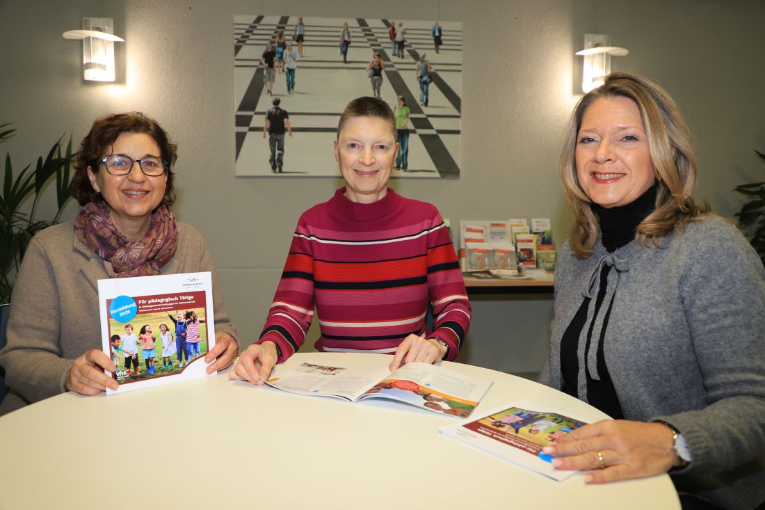 Marion Götz, vhs-Leiterin Ann-Karin Schild und Andrea Rosenberger (Fachstellenleitung Familienförderung) freuen sich über die große Resonanz der Kita-Beschäftigten auf dieses Angebot. „Ihr Interesse und ihre Bereitschaft, sich immer wieder neuen Herausforderungen im ihrem beruflichen Alltag zu stellen, sind wichtige Voraussetzungen, dass Kinder sich auch in schnelllebigen Zeiten in einem sicheren und gefestigten Umfeld entwickeln können. Das nötige Wissen geben wir ihnen gerne an die Hand“, betonen Götz, Schild und Rosenberger bei einem Blick in die neue Programm-Broschüre.