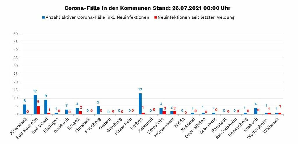 Die Zahl der nachgewiesenen Fälle von Corona-Infektionen im Wetteraukreis liegt am Montag (26. Juli) bei 13.291 (Stand RKI 00:00 Uhr). Die Inzidenz, die Zahl der Neuinfektionen pro 100.000 Einwohner binnen sieben Tagen liegt bei 10,7. Neuinfektionen wurden gemeldet aus Bad Nauheim (5), Bad Vilbel (1), Echzell (2), Karben (1), Limeshain (2), Münzenberg (2), Wölfersheim (1) und Wöllstadt (1).