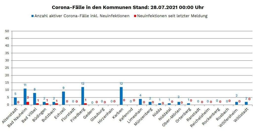 Die Zahl der nachgewiesenen Fälle von Corona-Infektionen im Wetteraukreis liegt am heutigen Donnerstag (29. Juli) bei 13.315 (Stand RKI O.OO Uhr, sechs mehr als am Dienstag gemeldet. Die Inzidenz, die Zahl der Neuinfektionen pro 100.000 Einwohner binnen sieben Tagen liegt bei 12,3. Neuinfektionen wurden aus Bad Nauheim (2), Bad Vilbel (1), Büdingen (1), Butzbach (1) und Friedberg (1) gemeldet.