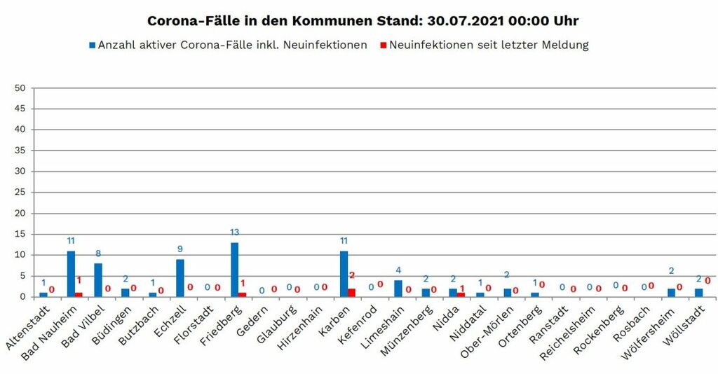 Foto: Übersicht über die aktiven Corona-Fälle in den Kommunen des Wetteraukreises.