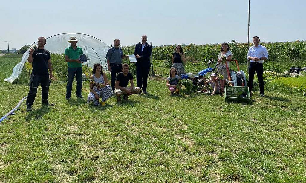 Kreisbeigeordneter Matthias Walther hat in Wölfersheim vor den Äckern des Vereins Bio-vegane SOLAWI – Guter Grund e.V. den Förderbescheid für das Regionalbudget 2021 an die Wirtschaftsförderung Wetterau (wfg) als Träger der LEADER-Regionalentwicklung übergeben.