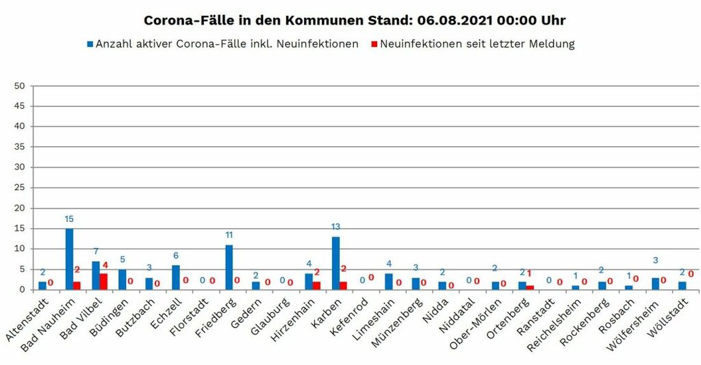 Die Zahl der nachgewiesenen Fälle von Corona-Infektionen im Wetteraukreis liegt am Freitag (6. August) bei 13.375 (Stand RKI O.OO Uhr), zehn mehr als am Donnerstag gemeldet. Die Inzidenz, die Zahl der Neuinfektionen pro 100.000 Einwohner binnen sieben Tagen liegt laut RKI bei 16,2. Die Neuinfektionen wurden aus Bad Nauheim (2), Bad Vilbel (4), Büdingen (-1), Hirzenhain (2), Karben (2) und Ortenberg (1) gemeldet.