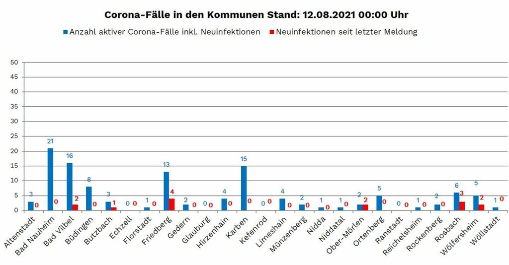 Die Zahl der nachgewiesenen Fälle von Corona-Infektionen im Wetteraukreis liegt am Donnerstag (12. August) bei 13.433 (Stand RKI 0.00 Uhr), 14 mehr als am Mittwoch gemeldet. Die Inzidenz, die Zahl der Neuinfektionen pro 100.000 Einwohner binnen sieben Tagen liegt laut RKI bei 20,4. Der aktuelle Anstieg der Infektionszahlen ist Fachleuten zufolge vor allem auf die Delta Variante des Virus zurückzuführen, das wegen seiner Mutation deutlich infektiöser sei als das Ursprungsvirus.