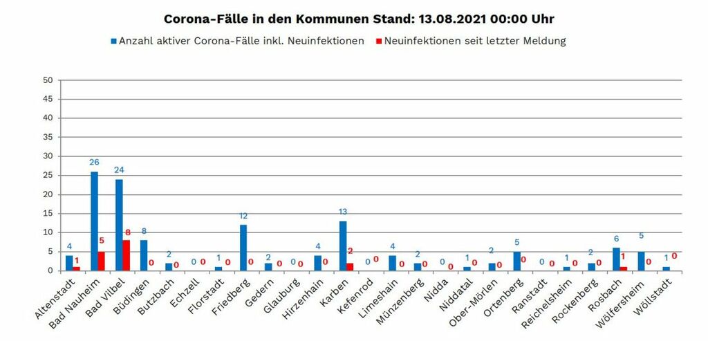 Die Zahl der nachgewiesenen Fälle von Corona-Infektionen im Wetteraukreis liegt am Freitag (13. August) bei 13.450 (Stand RKI 0.00 Uhr), 17 mehr als am Donnerstag gemeldet. Die Inzidenz, die Zahl der Neuinfektionen pro 100.000 Einwohner binnen sieben Tagen liegt laut RKI bei 23,4. Die Neuinfektionen wurden aus Altenstadt (1), Bad Nauheim (5), Bad Vilbel (8), Karben (2), und Rosbach (1) gemeldet. Todesfälle im Zusammenhang mit der Infektion wurden nicht gemeldet.