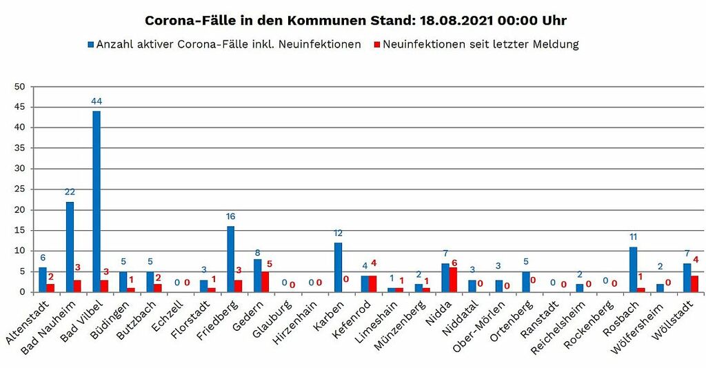 Die Zahl der nachgewiesenen Fälle von Corona-Infektionen im Wetteraukreis liegt am Mittwoch (18. August) bei 13.530 (Stand RKI 0.00 Uhr), 37 mehr als am Dienstag gemeldet. Die Inzidenz, die Zahl der Neuinfektionen pro 100.000 Einwohner binnen sieben Tagen liegt laut RKI bei 33,4. Die Neuinfektionen wurden aus Altenstadt (2), Bad Nauheim (3), Bad Vilbel (3), Büdingen (1), Butzbach (2), Florstadt (1), Friedberg (3), Gedern (5), Kefenrod (4), Limeshain (1), Münzenberg (1), Nidda (6), Ortenberg (1), Rosbach (1) und Wöllstadt (4) gemeldet.