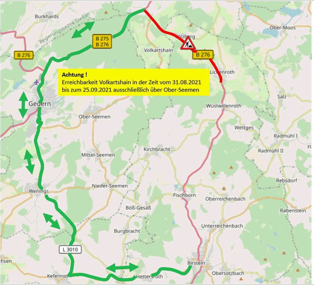 Grebenhain gelangt man ab Lichenroth über Grebenhain/Bermuthshain. Der Ortsteil Völzberg ist während des Bauabschnitts 3 ebenfalls über die Umleitungsstrecke von Bermuthshain aus zu erreichen. Für den Grebenhainer Ortsteil Volkartshain ist in der Zeit vom 31.08.2021 bis zum 25.09.2021 eine Erreichbarkeit ausschließlich aus Richtung Ober-Seemen gegeben.