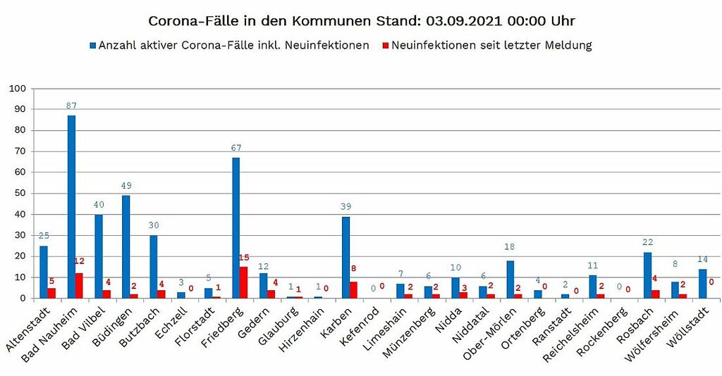 Die Neuinfektionen wurden gemeldet aus Altenstadt (5), Bad Nauheim (12), Bad Vilbel (4), Büdingen (2), Butzbach (4), Florstadt (1), Friedberg (15), Gedern (4), Glauburg (1), Karben (8), Limeshain (2), Münzenberg (2), Nidda (3), Niddatal (2), Ober-Mörlen (2), Reichelsheim (2), Rosbach (4) und Wölfersheim (2). Todesfälle im Zusammenhang mit der Infektion wurden nicht gemeldet.