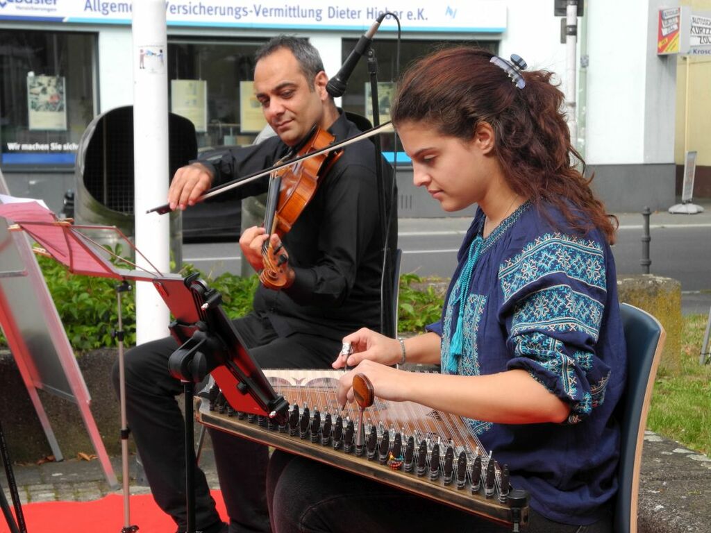 Für den musikalischen Rahmen sorgten Eleanna Pitsikaki und Rabie Azar, einem Duo von „Bridges – Musik verbindet“ aus Frankfurt. Eleanna Pitsikaki ist auf Kreta geboren. Ab 2010 erlernte sie Kanun und nahm an zahlreichen Workshops in Kreta teil. Seit 2016 lebt sie in Deutschland und hat an der Popakademie Mannheim ihren Bachelor im Studiengang für Weltmusik, Hauptfach Kanun abgeschlossen. Sie konzertiert weltweit mit ihrem eigenen Ensemble sowie als Gastmusikerin in Ensembles, Orchestern und Chören. Rabie Azar schloss 2005 sein Studium der Viola am Musikkonservatorium von Damaskus ab. Er ist in klassisch westlicher, traditioneller orientalischer und zeitgenössischer orientalischer Pop-Musik ausgebildet. In Syrien war er unter anderem Mitglied des Syrischen Nationalorchesters. Internationale Tourneen mit diesen Orchestern führten ihn u.a. nach Spanien, Italien, Türkei, Marokko, Tunesien nach Jordanien, den Libanon und die Arabischen Emirate.