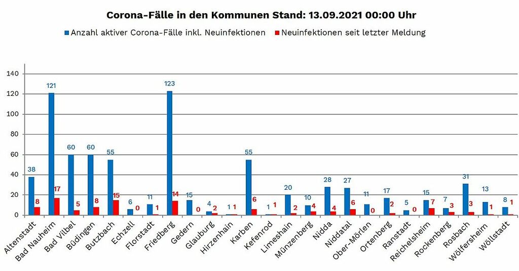 Neuinfektionen wurden aus 21 von 25 Kommunen gemeldet: Altenstadt (8), Bad Nauheim (17), Bad Vilbel (5), Büdingen (8), Butzbach (15), Florstadt (1), Friedberg (14), Glauburg (2), Hirzenhain (1), Karben (6), Kefenrod (1), Limeshain (2), Münzenberg (4), Nidda (4), Niddatal (6), Ortenberg (2), Reichelsheim (7), Rockenberg (3), Rosbach (3), Wölfersheim (1) und Wöllstadt (1). Ein Infektionsfall konnte nachträglich einer Kommune zugeordnet werden. Todesfälle im Zusammenhang mit der Infektion wurden nicht gemeldet.