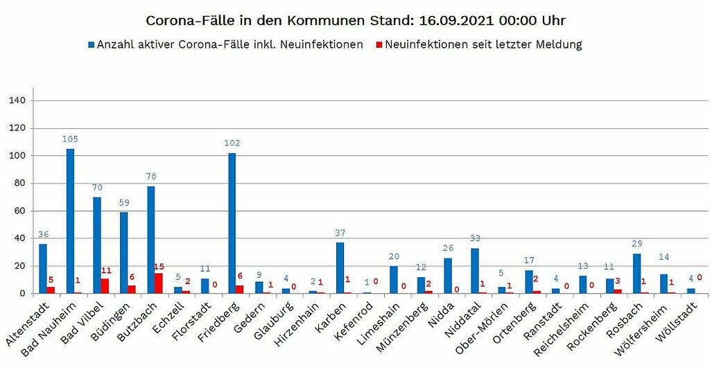 Neuinfektionen wurden gemeldet aus: Altenstadt (5), Bad Nauheim (1), Bad Vilbel (11), Büdingen (6), Butzbach (15), Echzell (2), Friedberg (6), Gedern (1), Hirzenhain (1), Karben (1), Münzenberg (2), Niddatal (1), Ober Mörlen (1), Ortenberg (2), Rockenberg (3), Rosbach (1) und Wölfersheim (1). Drei Infektionsfälle konnten noch keiner Kommune zugeordnet werden. Ein weiterer Todesfall wurde im Zusammenhang mit der Infektion gemeldet. Ein 39 Jahre alter Mann starb an den Folgen der Infektion