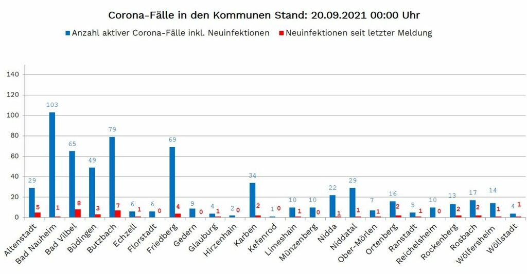 Die Zahl der seit Beginn der Pandemie nachgewiesenen Fälle von Corona-Infektionen im Wetteraukreis liegt am Montag (20. September) bei 14.837, 74 mehr als am Freitag gemeldet. Die Inzidenz, die Zahl der Neuinfektionen pro 100.000 Einwohner binnen sieben Tagen, liegt laut RKI bei 77,3. Neuinfektionen wurden gemeldet aus: Altenstadt (5), Bad Nauheim (1), Bad Vilbel (8), Büdingen (3), Butzbach (7), Echzell (1), Friedberg (4), Glauburg (1), Karben (2), Limeshain (1), Nidda (1), Niddatal (1), Ober Mörlen (1), Ortenberg (2), Ranstadt (1), Rockenberg (2), Rosbach (2), Wölfersheim (1) und Wöllstadt (1).