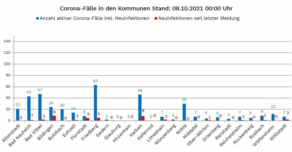 Die Zahl der seit Beginn der Pandemie nachgewiesenen Fälle von Corona-Infektionen im Wetteraukreis liegt am Freitag (8. Oktober) bei 15.382, 38 mehr als am Donnerstag gemeldet. Die Inzidenz, die Zahl der Neuinfektionen pro 100.000 Einwohner binnen sieben Tagen, liegt laut RKI im Wetteraukreis bei 58,6. Neuinfektionen wurden gemeldet aus Bad Nauheim 1, Bad Vilbel 2, Büdingen 9, Echzell 1, Florstadt 5, Friedberg 5, Karben 8, Limeshain 2, Ober-Mörlen 1, Reichelsheim 1, Rosbach 1 und Wöllstadt 2.
