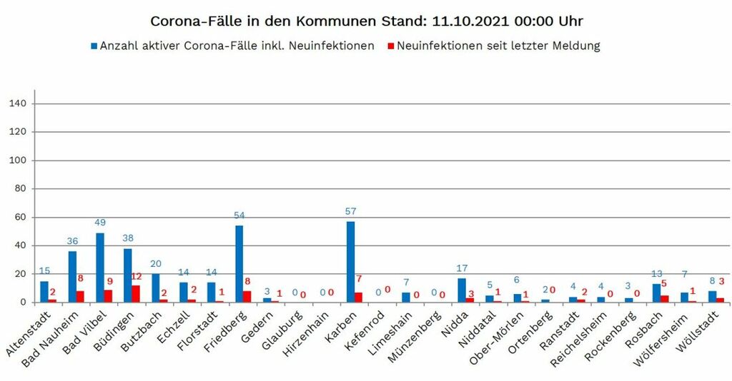 Die Zahl der seit Beginn der Pandemie nachgewiesenen Fälle von Corona-Infektionen im Wetteraukreis liegt am Montag (11. Oktober) bei 15.450, 68 mehr als am Freitag gemeldet. Die Inzidenz, die Zahl der Neuinfektionen pro 100.000 Einwohner binnen sieben Tagen, liegt laut RKI im Wetteraukreis bei 68. Neuinfektionen wurden gemeldet aus Altenstadt 2, Bad Nauheim 8, Bad Vilbel 9, Büdingen 12, Butzbach 2, Echzell 2, Florstadt 1, Friedberg 8, Gedern 1, Karben 7, Nidda 3, Niddatal 1, Ober-Mörlen 1, Ranstadt 2, Rosbach 5, Wölfersheim 1 und Wöllstadt 3.