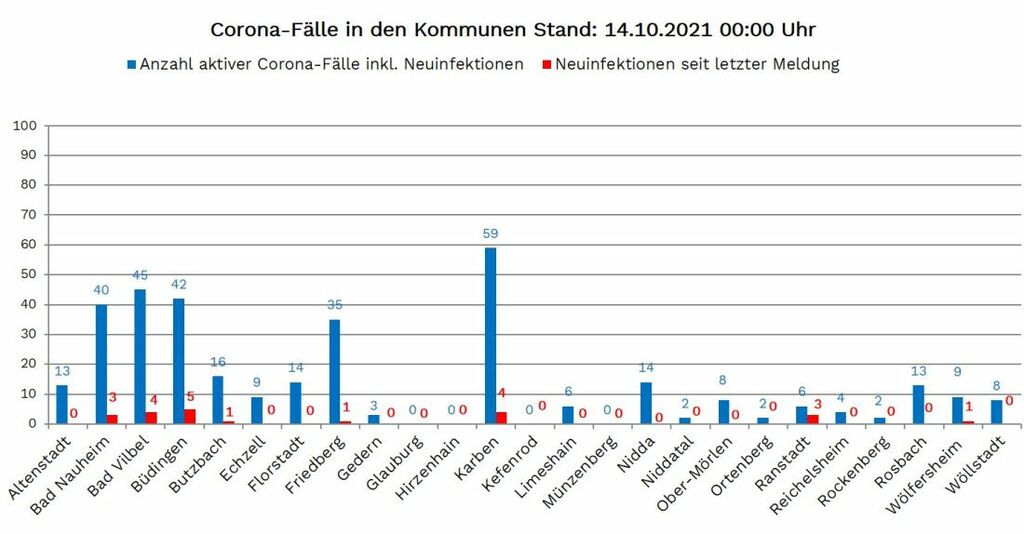Die Zahl der seit Beginn der Pandemie nachgewiesenen Fälle von Corona-Infektionen im Wetteraukreis liegt am Donnerstag (14. Oktober) bei 15.517, 22 mehr als am Mittwoch gemeldet. Die Inzidenz, die Zahl der Neuinfektionen pro 100.000 Einwohner binnen sieben Tagen, liegt laut RKI im Wetteraukreis bei 45,8. Neuinfektionen wurden gemeldet aus Bad Nauheim 3, Bad Vilbel 4, Büdingen 5, Butzbach 1, Friedberg 1, Karben 4, Ranstadt 3 und Wölfersheim 1.