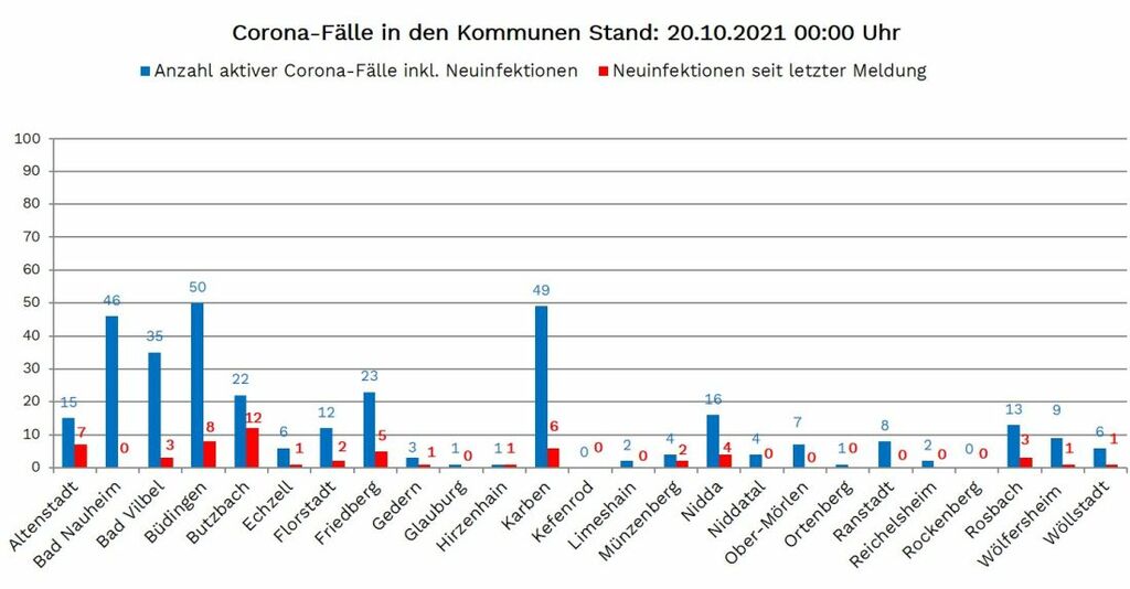 Die Zahl der seit Beginn der Pandemie nachgewiesenen Fälle von Corona-Infektionen im Wetteraukreis liegt am Mittwoch (20. Oktober) bei 15.669, 57 mehr als am Dienstag gemeldet. Die Inzidenz, die Zahl der Neuinfektionen pro 100.000 Einwohner binnen sieben Tagen, liegt laut RKI im Wetteraukreis bei 50,6. Neuinfektionen wurden gemeldet aus Altenstadt 7, Bad Vilbel 3, Büdingen 8, Butzbach 12, Echzell 1, Florstadt 2, Friedberg 5, Gedern 1, Hirzenhain 1, Karben 6, Münzenberg 2, Nidda 4, Rosbach 3, Wölfersheim 1 und Wöllstadt 1.
