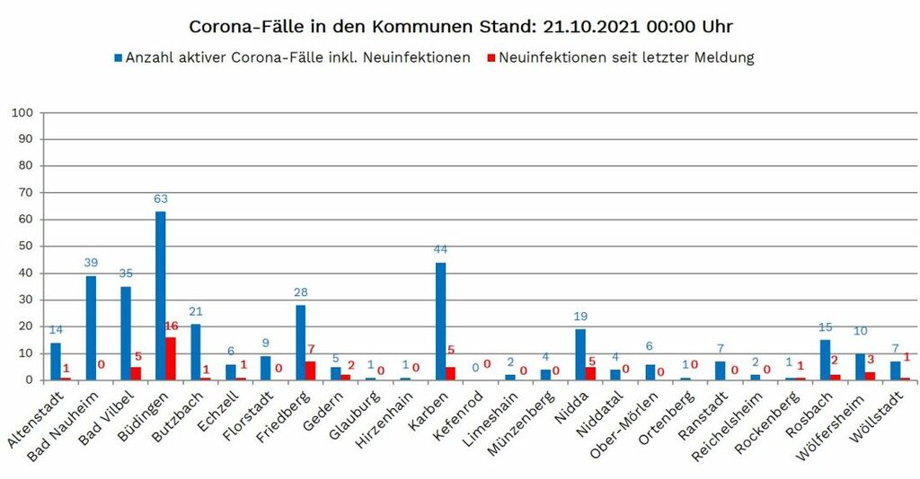 In Büdingen wurden allen anwesenden Kindern nach mehreren Infektionsfällen in zwei Kindertagesstätten durch das Gesundheitsamt eine häusliche Quarantäne angeordnet. Beide Kindertagesstätten sind daher für diese Woche nicht in Betrieb. Nach erfolgter negativer Testung können die betroffenen Kinder nächste Woche wieder die Tagesstätten besuchen.