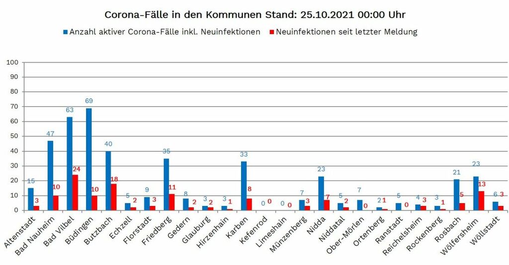 Die Infektionen wurden gemeldet aus: Altenstadt 3, Bad Nauheim 10, Bad Vilbel 24, Büdingen 10, Butzbach 18, Echzell 2, Florstadt 3, Friedberg 11, Gedern 2, Glauburg 2, Hirzenhain 1, Karben 8, Münzenberg 3, Nidda 7, Niddatal 2, Ortenberg 1, Reichelsheim 3, Rockenberg 1, Rosbach 5, Wölfersheim 13, Wöllstadt 3.
