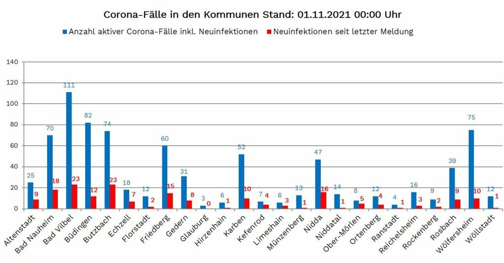 Neuinfektionen wurden aus 24 von 25 Wetterauer Kommunen gemeldet. Die Infektionen wurden gemeldet aus Altenstadt 9, Bad Nauheim 18, Bad Vilbel 23, Büdingen 12, Butzbach 23, Echzell 7, Florstadt 2, Friedberg 15, Gedern 8, Hirzenhain 1, Karben 10, Kefenrod 4, Limeshain 3, Münzenberg 1, Nidda 16, Niddatal 1, Ober-Mörlen 5, Ortenberg 4, Ranstadt 1, Reichelsheim 3, Rockenberg 2, Rosbach 9, Wölfersheim 10, Wöllstadt 1.