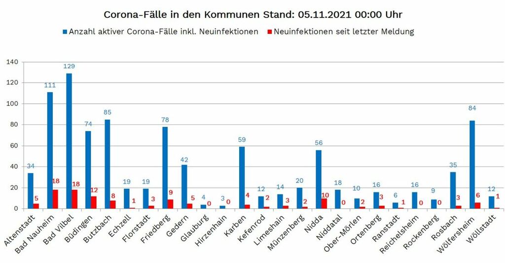Die Infektionen wurden gemeldet aus Altenstadt 5, Bad Nauheim 18, Bad Vilbel 18, Büdingen 12, Butzbach 8, Echzell 1, Florstadt 3, Friedberg 9, Gedern 5, Karben 4, Kefenrod 2, Limeshain 3, Münzenberg 2, Nidda 10, Ober Mörlen 2, Ortenberg 3, Ranstadt 1, Rosbach 3, Wölfersheim 6 und Wöllstadt 1.
