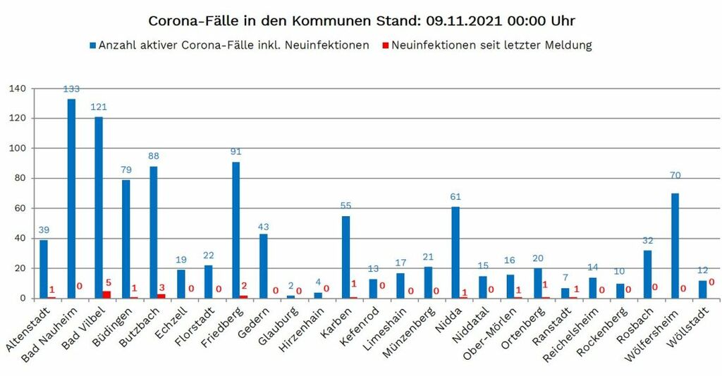 Die Zahl der seit Beginn der Pandemie nachgewiesenen Fälle von Corona-Infektionen im Wetteraukreis liegt am Dienstag (9. November) bei 16.979, 17 mehr als am Montag gemeldet. Die Inzidenz, die Zahl der Neuinfektionen pro 100.000 Einwohner binnen sieben Tagen, liegt laut RKI im Wetteraukreis bei 160,8. Neuinfektionen gemeldet aus Altenstadt 1, Bad Nauheim 5, Büdingen 1, Butzbach 3, Friedberg 2, Karben 1, Nidda 1, Ober Mörlen 1, Ortenberg 1 und Ranstadt 1.