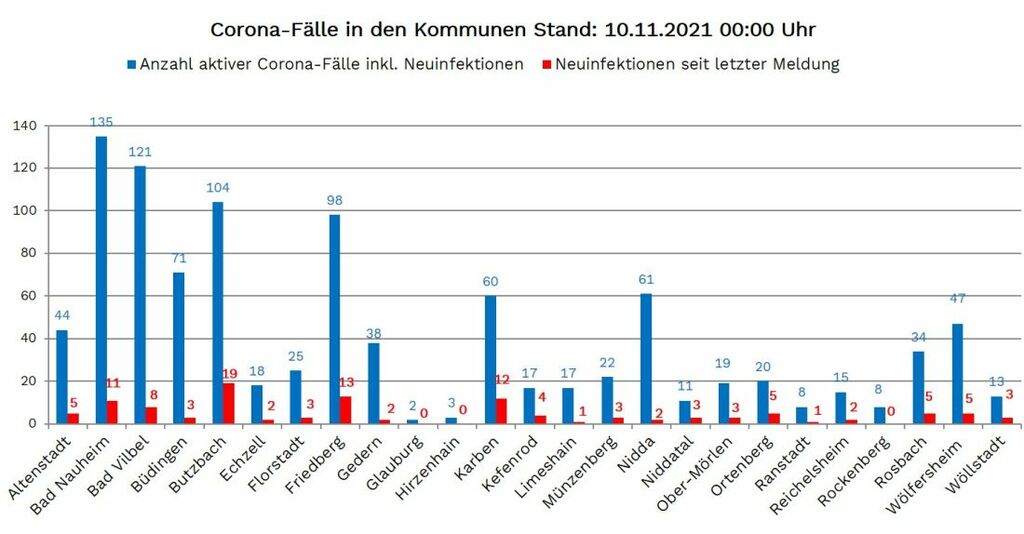 Neuinfektionen wurden aus 22 der 25 Wetterauer Kommunen gemeldet: Altenstadt 5, Bad Nauheim 11, Bad Vilbel 8, Büdingen 3, Butzbach 19, Echzell 2, Florstadt 3, Friedberg 13, Gedern 2, Karben 12, Kefenrod 4, Limeshain 1, Münzenberg 3, Nidda 2, Niddatal 3, Ober Mörlen 3, Ortenberg 5, Ranstadt 1, Reichelsheim 2, Rosbach 5, Wölfersheim 5, Wöllstadt 3.