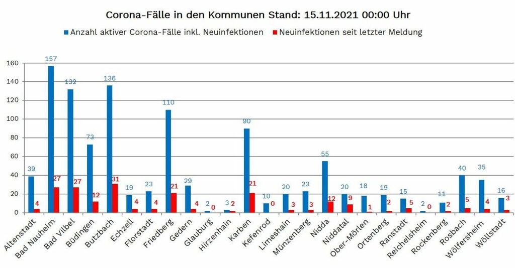 Neuinfektionen wurden aus 22 der 25 Wetterauer Kommunen gemeldet: Altenstadt 4, Bad Nauheim 27, Bad Vilbel 27, Büdingen 12, Butzbach 31, Echzell 4, Florstadt 4, Friedberg 21, Gedern 4, Hirzenhain 2, Karben 21, Limeshain 3, Münzenberg 3, Nidda 12, Niddatal 9, Ober-Mörlen 1, Ortenberg 2, Ranstadt 5, Rockenberg 2, Rosbach 5, Wölfersheim 4, Wöllstadt 3.