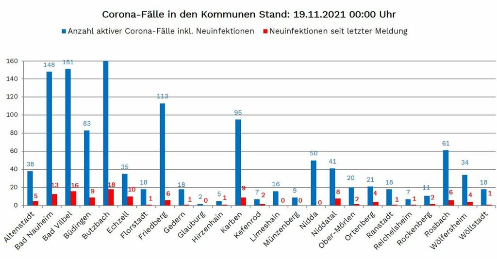 Neuinfektionen wurden gemeldet aus: Altenstadt 5, Bad Nauheim 13, Bad Vilbel 16, Büdingen 9, Butzbach 18, Echzell 10, Florstadt 1, Friedberg 6, Gedern 1, Hirzenhain 1, Karben 9, Kefenrod 2, Niddatal 8, Ober-Mörlen 2, Ortenberg 4, Ranstadt 1, Reichelsheim 1, Rockenberg 2, Rosbach 6, Wölfersheim 4, Wöllstadt 1.