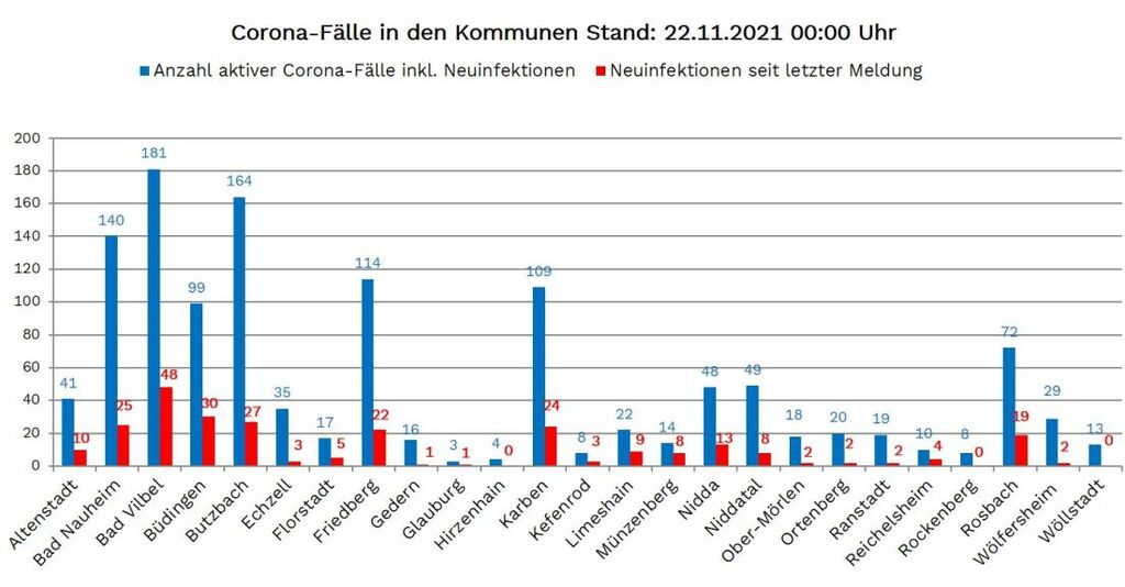 Neuinfektionen wurden gemeldet aus: Altenstadt 10, Bad Nauheim 25, Bad Vilbel 48, Büdingen 30, Butzbach 27, Echzell 3, Florstadt 5, Friedberg 22, Gedern 1, Glauburg 1, Karben 24, Kefenrod 3, Limeshain 9, Münzenberg 8, Nidda 13, Niddatal 8, Ober-Mörlen 2, Ortenberg 2, Ranstadt 2, Reichelsheim 4, Rosbach 19, Wölfersheim 2. Ein Infektionsfall konnte noch keiner Kommune zugeordnet werden.