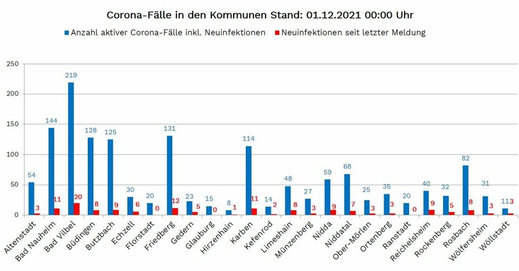 Neuinfektionen wurden gemeldet aus: Altenstadt 3, Bad Nauheim 11, Bad Vilbel 20, Büdingen 8, Butzbach 9, Echzell 6, Friedberg 12, Gedern 5, Hirzenhain 1, Karben 11, Kefenrod 2, Limeshain 8, Münzenberg 3, Nidda 9, Niddatal 7, Ober Mörlen 3, Ortenberg 3, Reichelsheim 9, Rockenberg 5, Rosbach 8, Wölfersheim 3, Wöllstadt 3. Ein Infektionsfall konnte noch keiner Kommune zugeordnet werden.