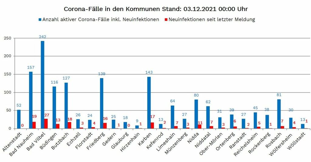 Neuinfektionen wurden aus 23 der 25 Wetterauer Kommunen gemeldet: Bad Nauheim 19, Bad Vilbel 27, Büdingen 13, Butzbach 18, Echzell 3, Florstadt 4, Friedberg 16, Gedern 1, Hirzenhain 1, Karben 17, Kefenrod 2, Limeshain 7, Münzenberg 3, Nidda 11, Niddatal 7, Ober Mörlen 3, Ortenberg 6, Ranstadt 2, Reichelsheim 5, Rockenberg 1, Rosbach 7, Wölfersheim 4, Wöllstadt 1.