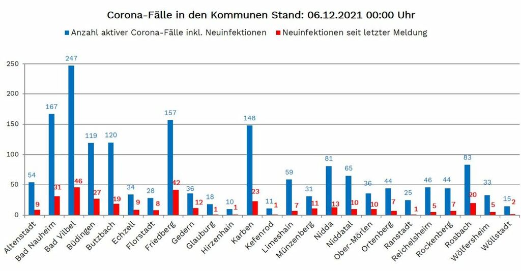 Neuinfektionen wurden aus allen 25 Wetterauer Kommunen gemeldet: Altenstadt 9, Bad Nauheim 31, Bad Vilbel 46, Büdingen 27, Butzbach 19, Echzell 9, Florstadt 8, Friedberg 42, Gedern 12, Glauburg 1, Hirzenhain 1, Karben 23, Kefenrod 1, Limeshain 7, Münzenberg 11, Nidda 13, Niddatal 10, Ober Mörlen 10, Ortenberg 7, Ranstadt 1, Reichelsheim 5, Rockenberg 7, Rosbach 20, Wölfersheim 5, Wöllstadt 2.