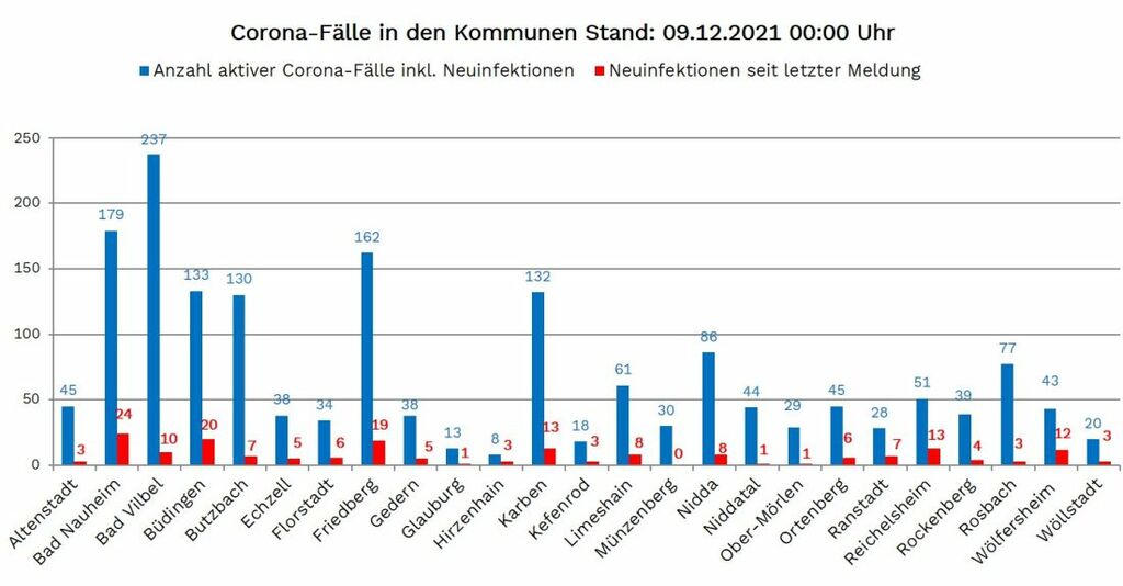 Neuinfektionen wurden aus 24 von 25 Kommunen gemeldet: Neuinfektionen wurden aus 24 von 25 Kommunen gemeldet: Altenstadt 3, Bad Nauheim 24, Bad Vilbel 10, Büdingen 20, Butzbach 7, Echzell 5, Florstadt 6, Friedberg 19, Gedern 5, Glauburg 1, Hirzenhain 3, Karben 13, Kefenrod 3, Limeshain 8, Nidda 8, Niddatal 1, Ober Mörlen 1, Ortenberg 6, Ranstadt 7, Reichelsheim 13, Rockenberg 4, Rosbach 3, Wölfersheim 12, Wöllstadt 3.