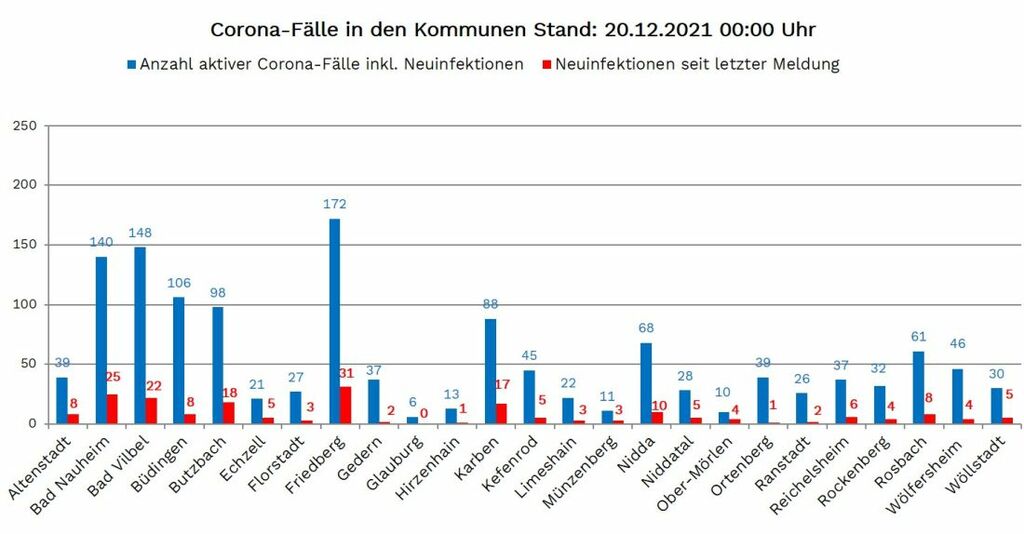 Neuinfektionen wurden aus 24 von 25 Kommunen gemeldet: Altenstadt 8, Bad Nauheim 25, Bad Vilbel 22, Büdingen 8, Butzbach 18, Echzell 5, Florstadt 3, Friedberg 31, Gedern 2, Hirzenhain 1, Karben 17, Kefenrod 5, Limeshain 3, Münzenberg 3, Nidda 10, Niddatal 5, Ober Mörlen 4, Ortenberg 1, Ranstadt 2, Reichelsheim 6, Rockenberg 4, Rosbach 8, Wölfersheim 4, Wöllstadt 5.