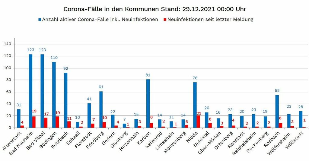 Neuinfektionen wurden aus allen 25 Kommunen gemeldet: Altenstadt 4, Bad Nauheim 19, Bad Vilbel 17, Büdingen 19, Butzbach 11 ,Echzell 2, Florstadt 7, Friedberg 10, Gedern 4, Glauburg 1, Hirzenhain 3, Karben 8, Kefenrod 2, Limeshain 1, Münzenberg 5, Nidda 21, Niddatal 8, Ober-Mörlen 3, Ortenberg 4, Ranstadt 2, Reichelsheim 2, Rockenberg 2, Rosbach 8, Wölfersheim 3 und Wöllstadt 1.