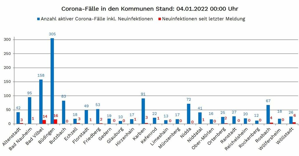 Die Zahl der seit Beginn der Pandemie nachgewiesenen Fälle von Corona-Infektionen im Wetteraukreis liegt am Dienstag (04. Januar 2022) bei 22.820, 58 mehr als am Montag gemeldet. Die Inzidenz, die Zahl der Neuinfektionen pro 100.000 Einwohner binnen sieben Tagen, liegt laut RKI bei 258,7. Neuinfektionen wurden gemeldet aus: Altenstadt 3, Bad Nauheim 1, Bad Vilbel 14, Büdingen 16, Echzell 3, Florstadt 1, Friedberg 2, Hirzenhain 1, Karben 3, Kefenrod 1, Niddatal 1, Ortenberg 2, Rosbach 4 und Wöllstadt 6.