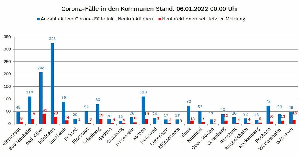 Neuinfektionen wurden aus 24 der 25 Wetterauer Kommunen gemeldet: Altenstadt 9, Bad Nauheim 19, Bad Vilbel 41, Büdingen 29, Butzbach 14, Echzell 1, Florstadt 3, Friedberg 19, Gedern 4, Glauburg 4, Hirzenhain 6, Karben 19, Kefenrod 1, Limeshain 3, Nidda 13, Niddatal 7, Ober Mörlen 2, Ortenberg 13, Ranstadt 4, Reichelsheim 4, Rockenberg 5, Rosbach 10, Wölfersheim 13 und Wöllstadt 16.