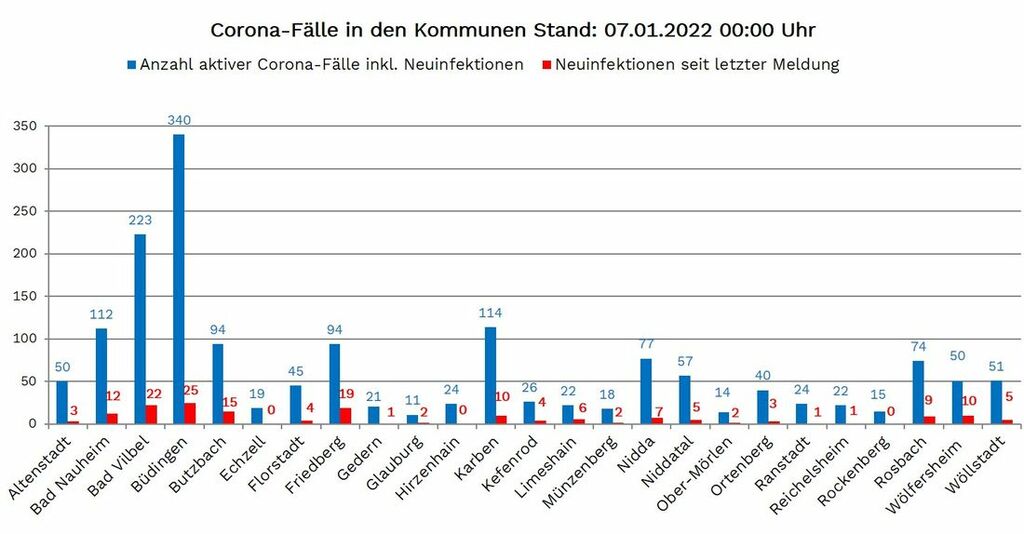 Die Zahl der seit Beginn der Pandemie nachgewiesenen Fälle von Corona-Infektionen im Wetteraukreis liegt am Freitag (07. Januar 2022) bei 23.463, 168 mehr als am Donnerstag gemeldet. Die Inzidenz, die Zahl der Neuinfektionen pro 100.000 Einwohner binnen sieben Tagen, liegt laut RKI bei 300. Neuinfektionen wurden aus 22 der 25 Wetterauer Kommunen gemeldet: Altenstadt 3, Bad Nauheim 12, Bad Vilbel 22, Büdingen 25, Butzbach 15, Florstadt 4, Friedberg 19, Gedern 1, Glauburg 2, Karben 10, Kefenrod 4, Limeshain 6, Münzenberg 2, Nidda 7, Niddatal 5, Ober Mörlen 2, Ortenberg 3, Ranstadt 1, Reichelsheim 1, Rosbach 9, Wölfersheim 10 und Wöllstadt 5.