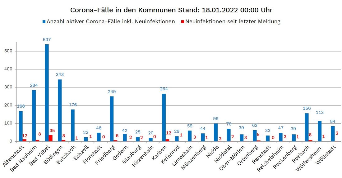 Neuinfektionen wurden aus 22 der 25 Wetterauer Kommunen gemeldet: Altenstadt 12, Bad Nauheim 8, Bad Vilbel 35, Büdingen 8, Butzbach 1, Echzell 1, Friedberg 6, Gedern 2, Glauburg 2, Karben 12, Kefenrod 1, Limeshain 3, Münzenberg 1, Nidda 3, Niddatal 2, Ober Mörlen 3, Ortenberg 5, Reichelsheim 3, Rockenberg 1, Rosbach 6, Wölfersheim 1, Wöllstadt 2.
